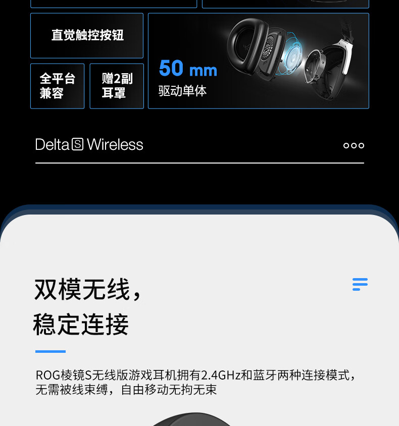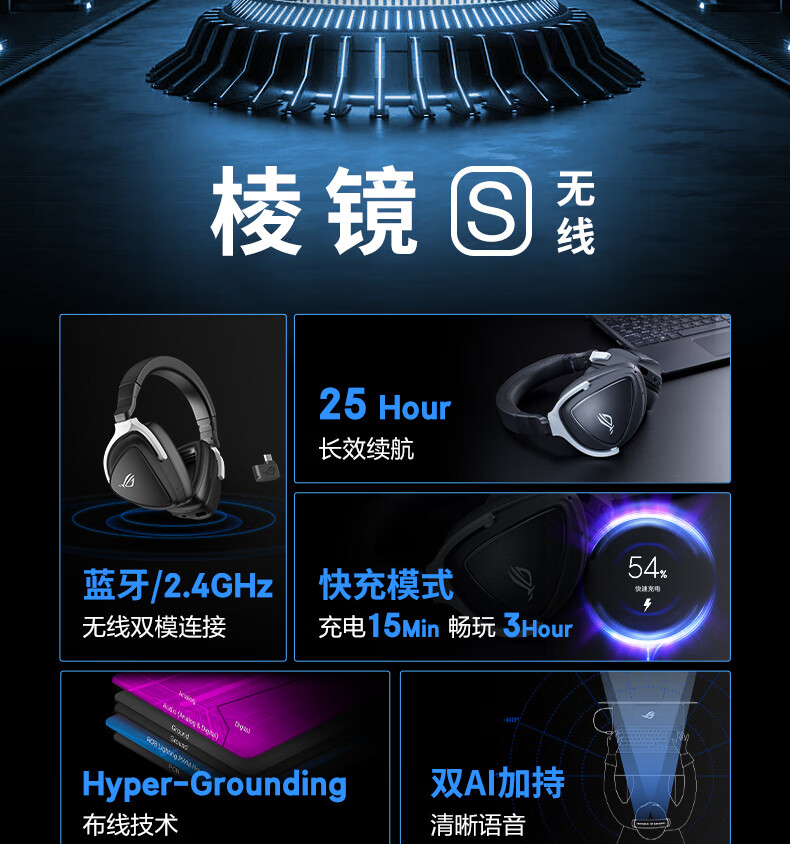 商品名称:ROG 棱镜s无线 游戏耳机 头戴式耳机 双模连接 蓝牙无线 环绕7.1音效 轻量化 AI降噪麦克风 ROG手机耳机