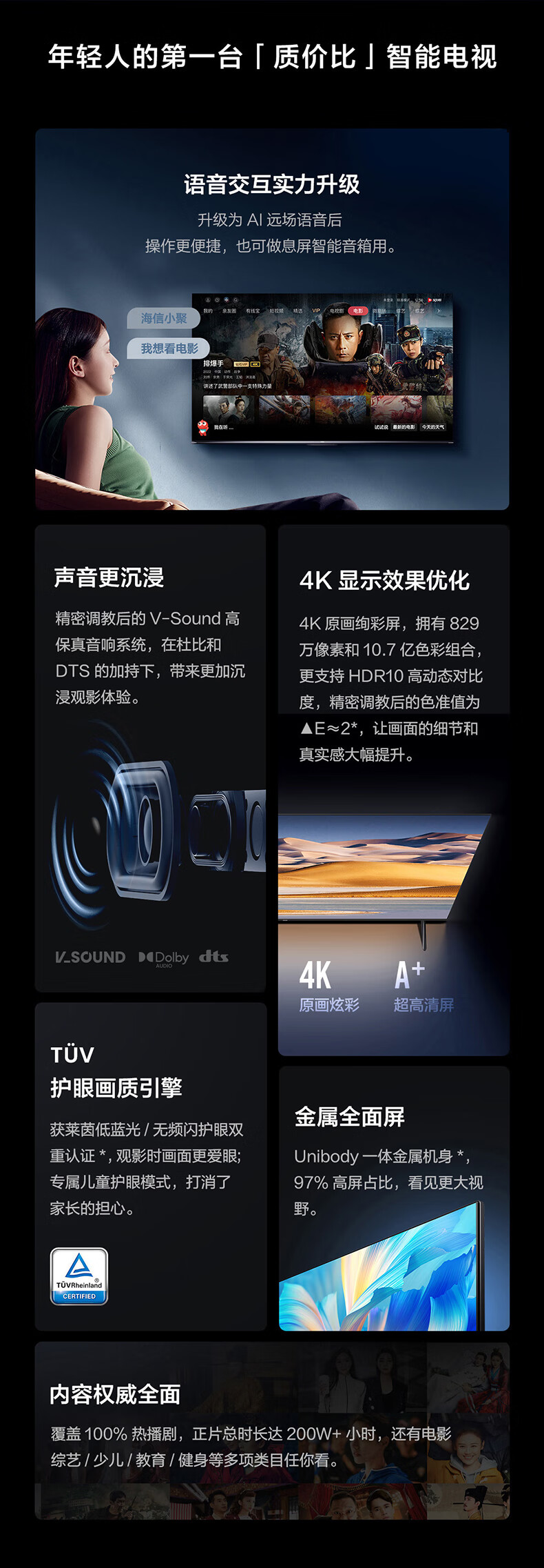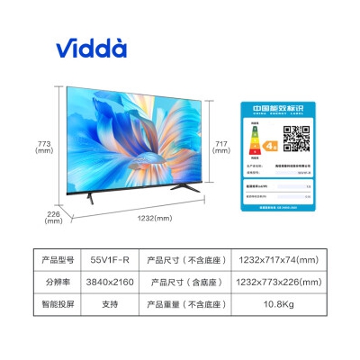 商品名称:Vidda 海信 R55 55英寸 超高清 超薄电视 全面屏电视 智慧屏 1.5G+8G 智能液晶巨幕电视以旧换新55V1F-R