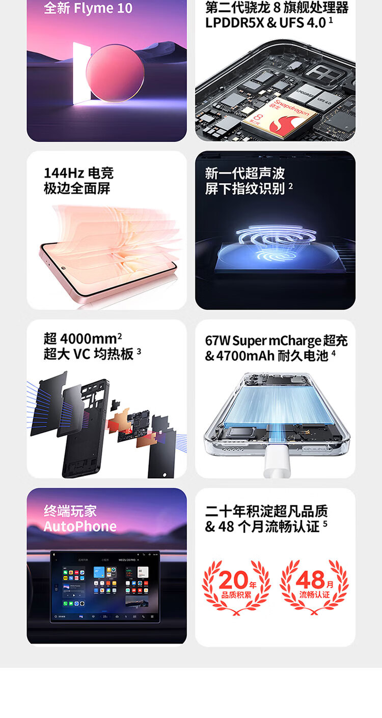 魅族 20 12GB+256GB 定胜青 第二代骁龙8旗舰芯片 144Hz电竞直屏 支持67W快充 超薄机身设计 5G手机